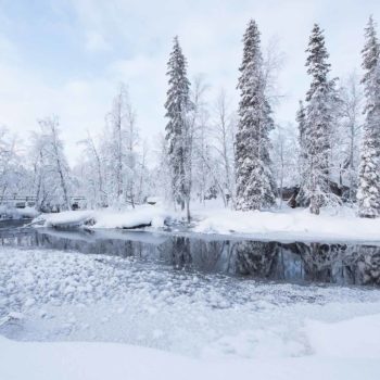 rivière non gelée dans un paysage enneigé de laponie. ©Angélique Michel